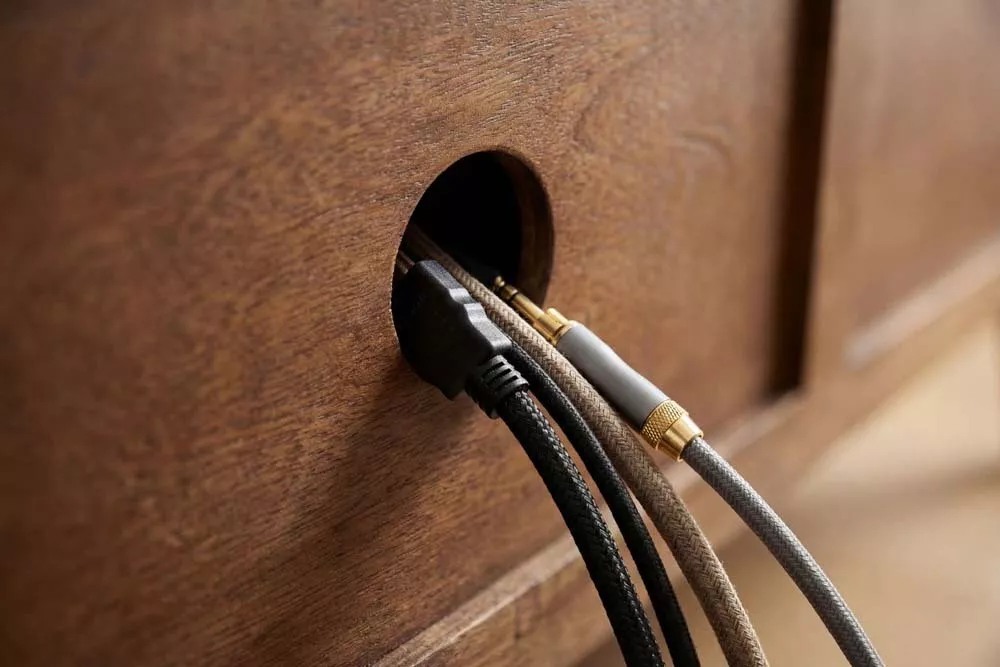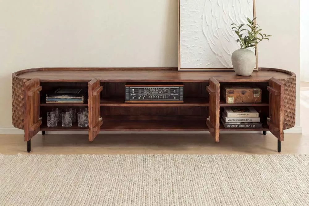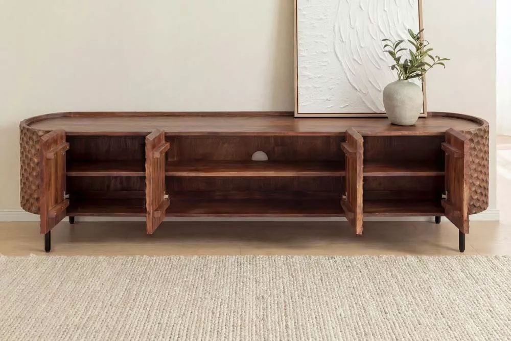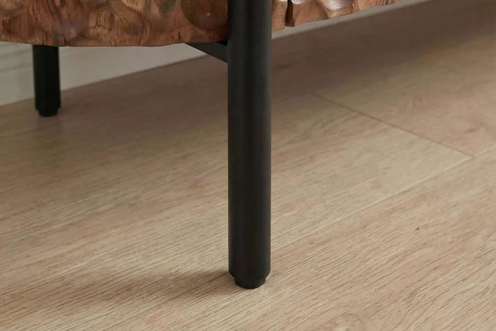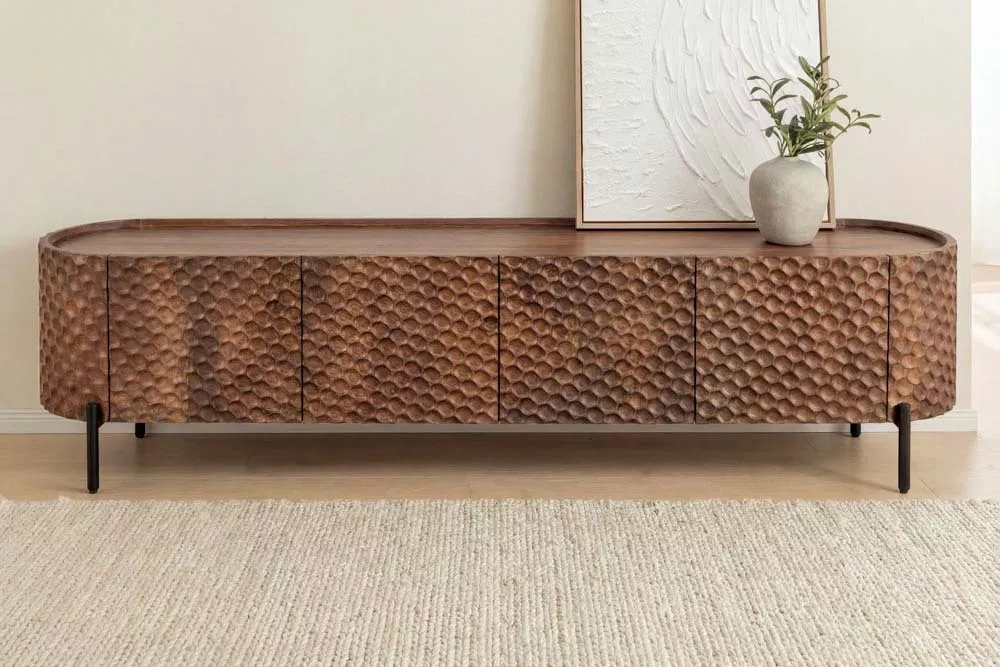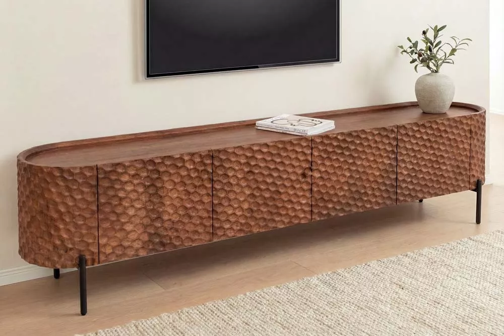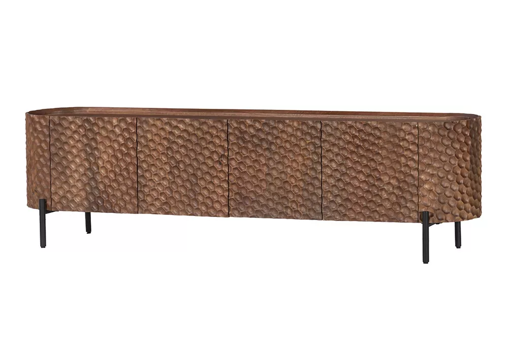 Televizní stolek ADLON z masivního mangového dřeva zaujme originální 3D čelní plochou v dekoru včelí plástve, která dodává nábytku hloubku a jedinečný charakter. Kombinace hnědého odstínu a černých kovových prvků podtrhuje moderní až industriální styl, zatímco praktické úložné prostory s tichým soft-close zavíráním a kabelový průchod zajišťují maximální komfort při každodenním používání. Tento výrazný televizní stolek se stane funkčním i designovým centrem vašeho obývacího pokoje.