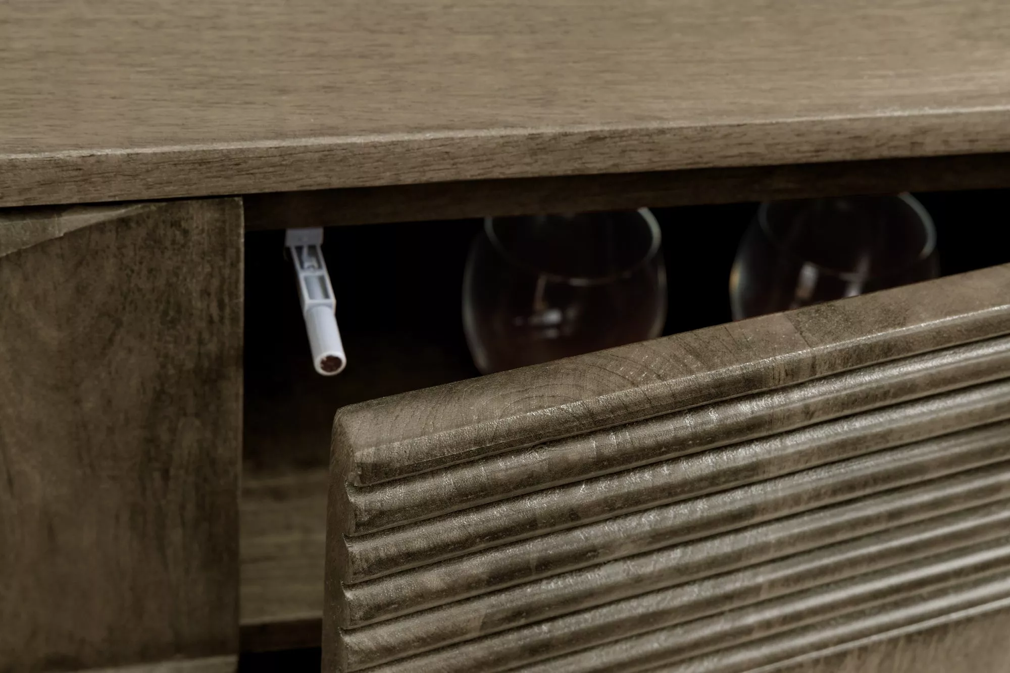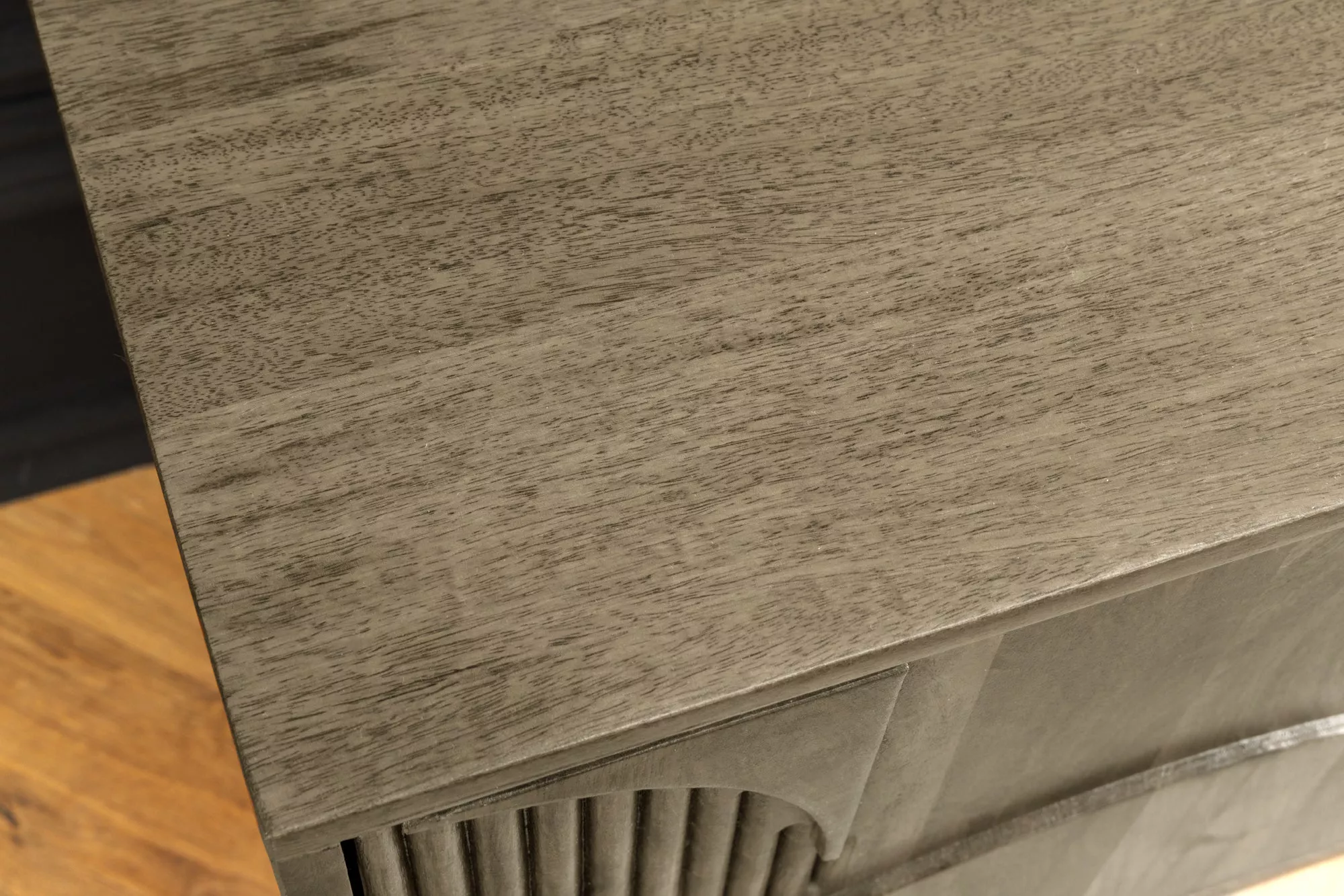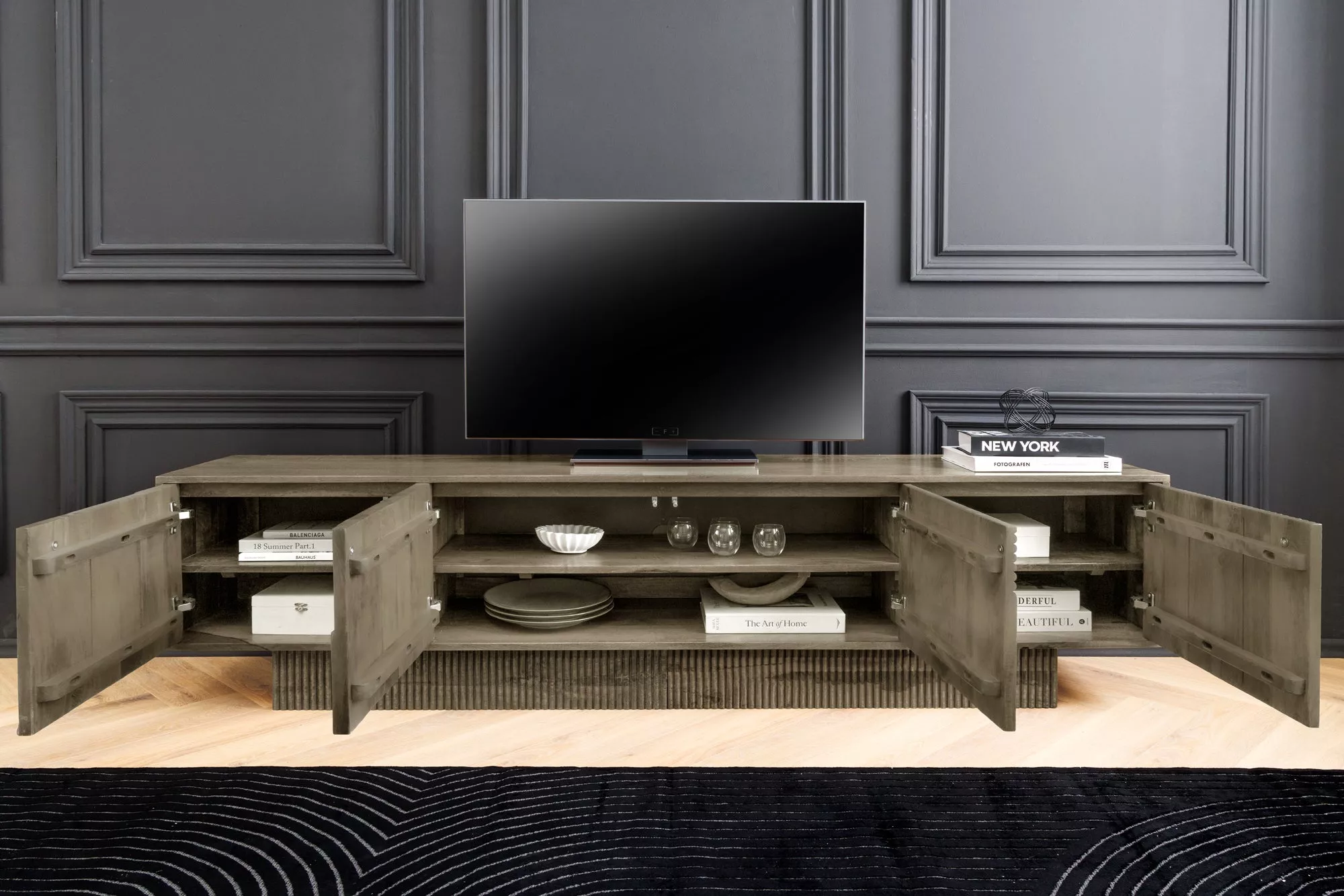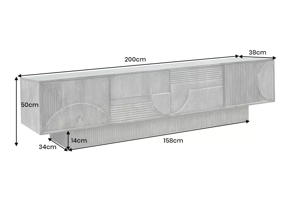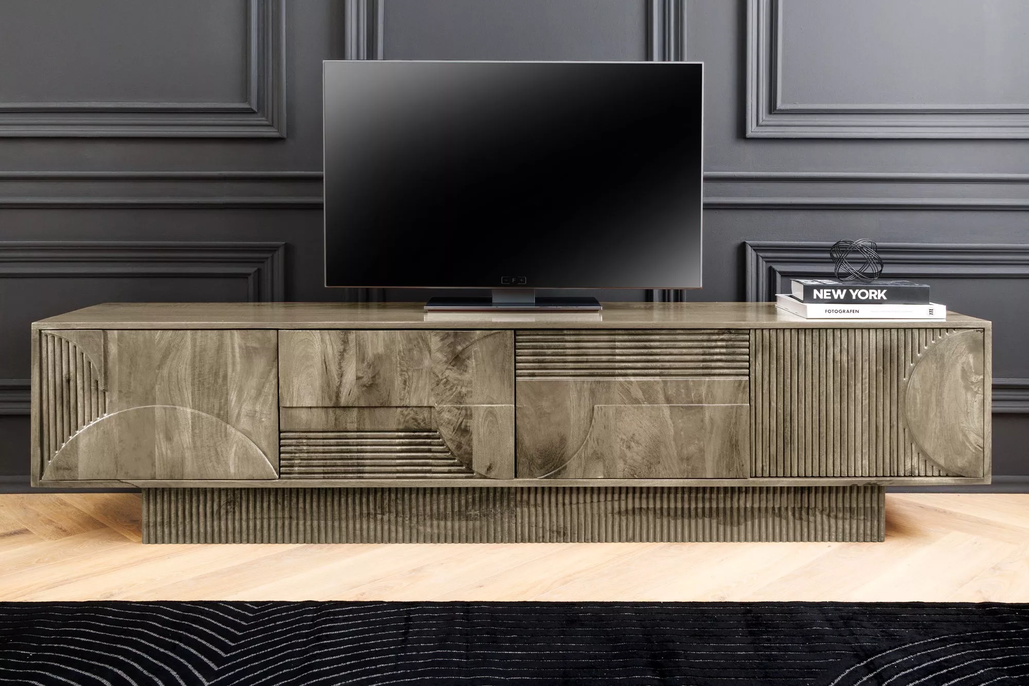 Masivní televizní stolek ART DECO II v elegantní šedé barvě nabízí šířku 200 cm a je zhotoven z mangového dřeva s výraznou 3D přední stranou. Za čtyřmi dvířky s funkcí push-to-open se nachází praktický úložný prostor ideální pro televizní techniku, knihy či dekorace. Nábytek je dodáván již smontovaný, připravený k okamžitému použití. Každý kus je originál – jemné barevné rozdíly a přírodní struktura dřeva dodávají stolku autentický charakter.