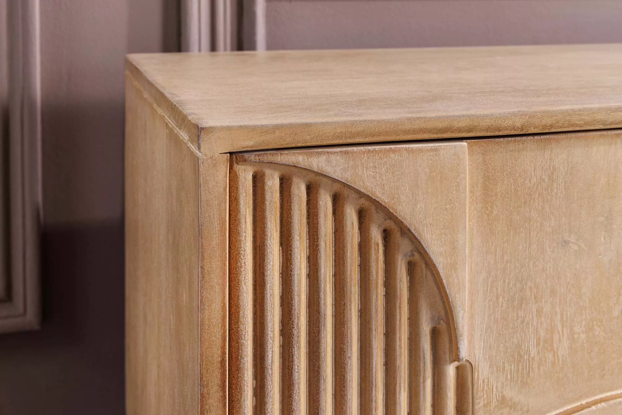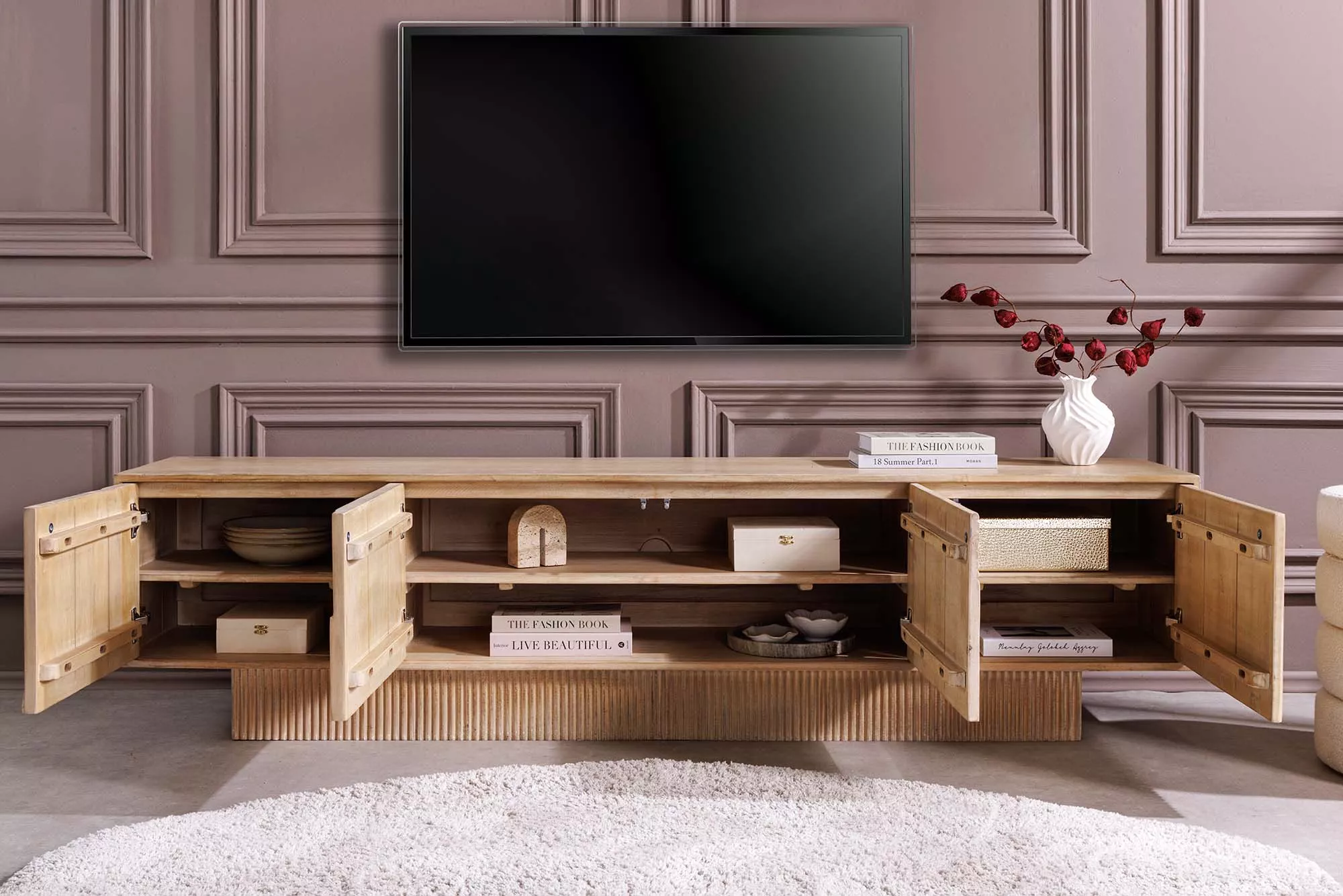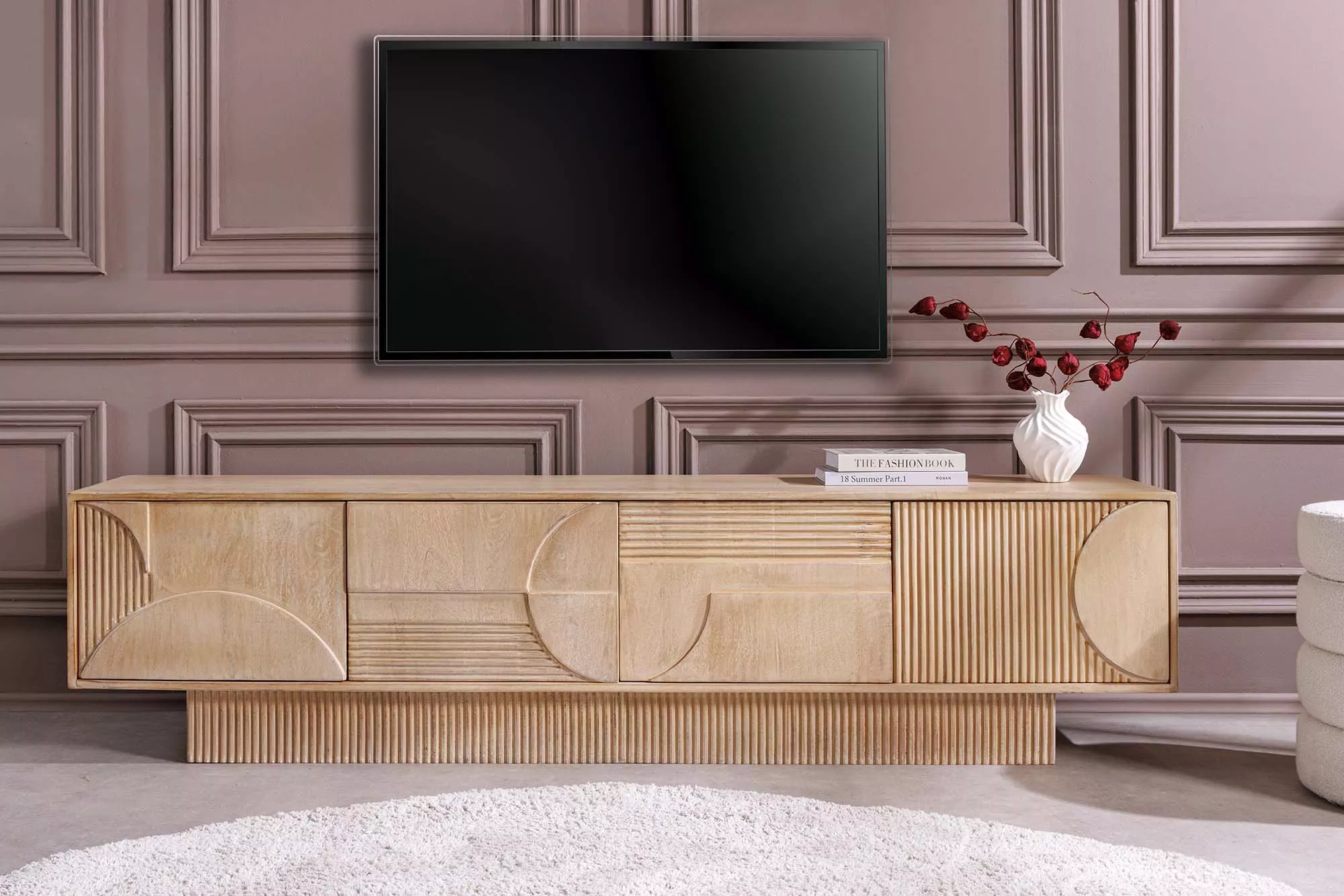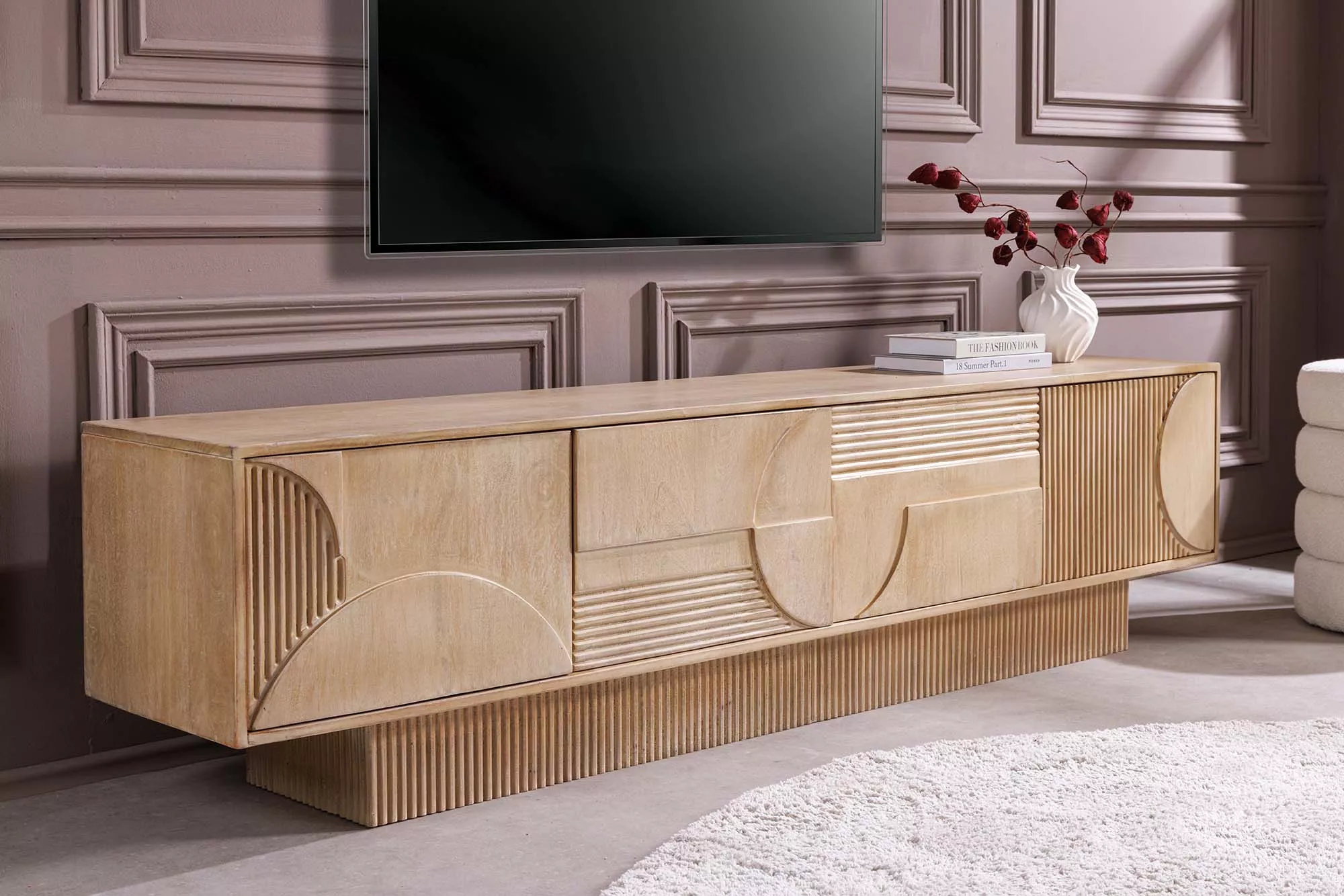 Masivní televizní stolek ART DECO II v elegantní přírodní bílé barvě nabízí šířku 200 cm a je zhotoven z mangového dřeva s výraznou 3D přední stranou. Za čtyřmi dvířky s funkcí push-to-open se nachází praktický úložný prostor ideální pro televizní techniku, knihy či dekorace. Nábytek je dodáván již smontovaný, připravený k okamžitému použití. Každý kus je originál – jemné barevné rozdíly a přírodní struktura dřeva dodávají stolku autentický charakter.