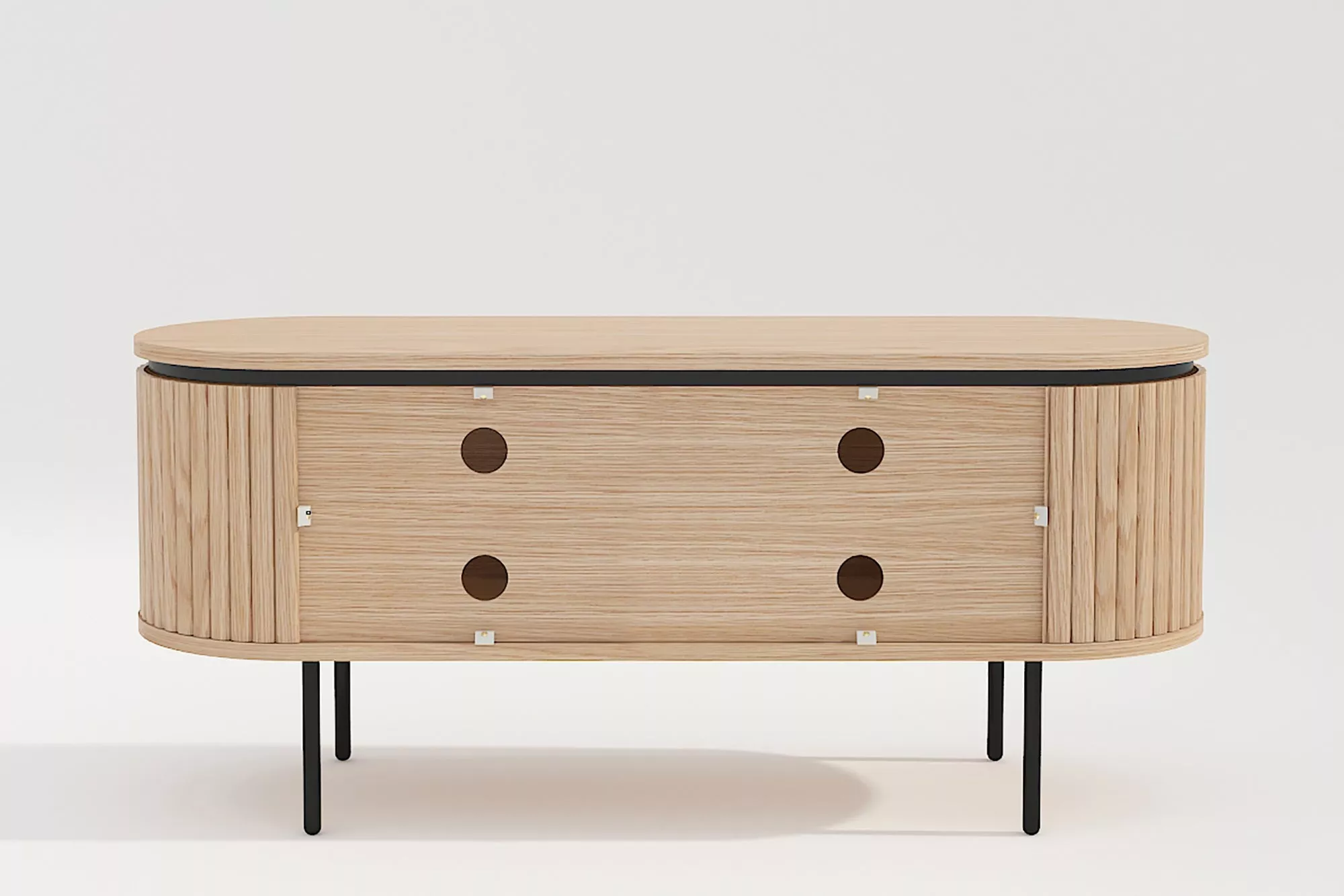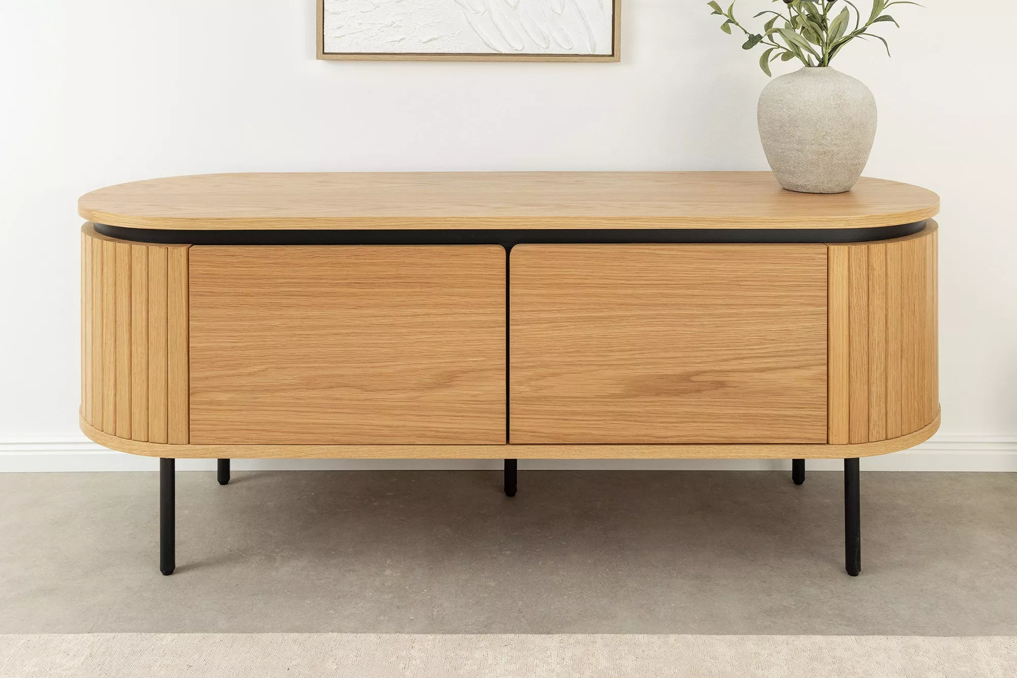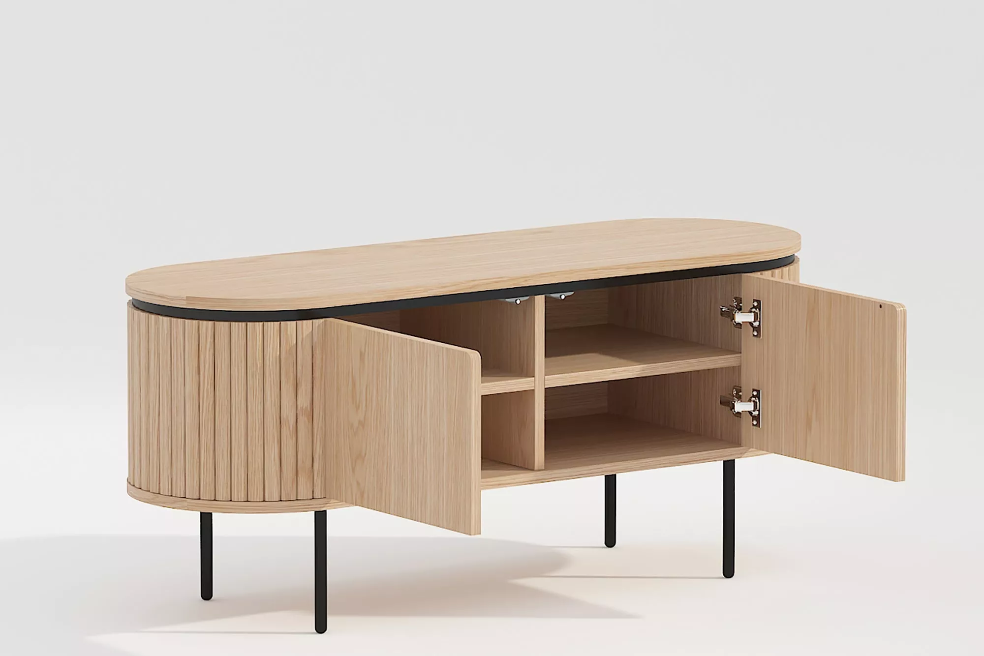 TV stolek ATELIER o šířce 120 cm je ideální volbou pro ty, kteří hledají funkční a stylový nábytek v minimalistickém skandinávském designu. Korpus z přírodního dubového dřeva je doplněn černým kovovým rámem, který vytváří elegantní kontrast. Za dvěma dvířky se nacházejí čtyři prostorné přihrádky, ideální pro uložení elektroniky, herních konzolí nebo dekoračních předmětů. Každá přihrádka je vybavena praktickým otvorem pro kabely, což usnadňuje organizaci a minimalizuje nepořádek. Nastavitelné podložky umožňují stabilní postavení na různých typech podlah, včetně dlaždic, parket nebo koberců. Maximální nosnost stolku je přibližně 40 kg, což zajišťuje dostatečnou pevnost pro většinu televizí a audio zařízení.
