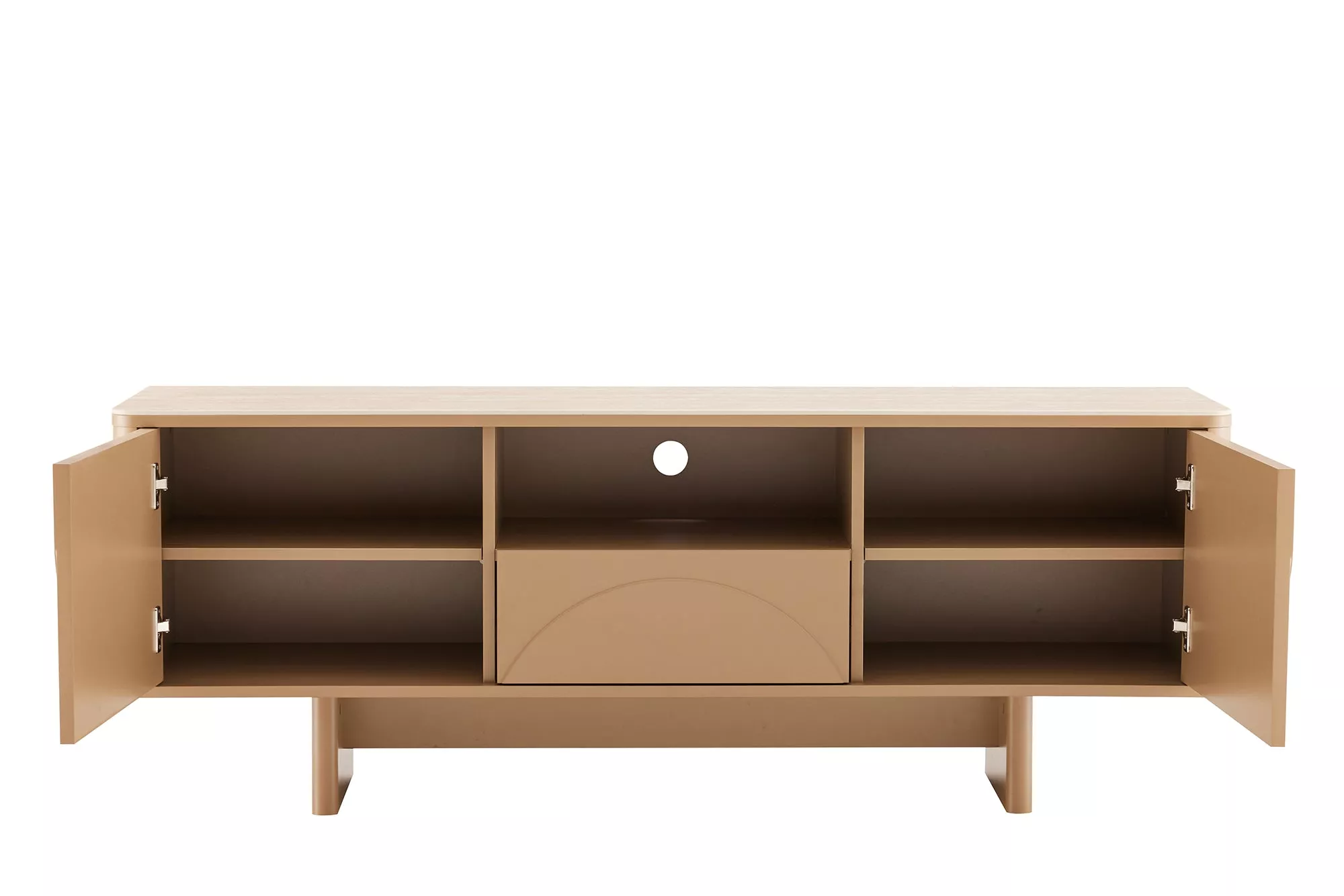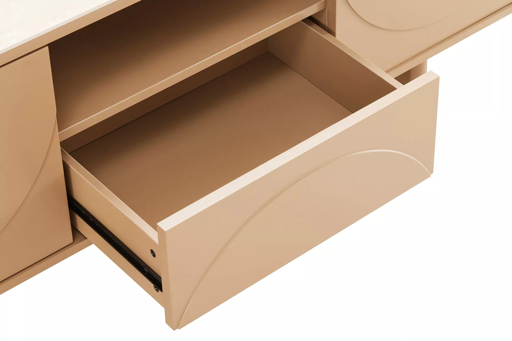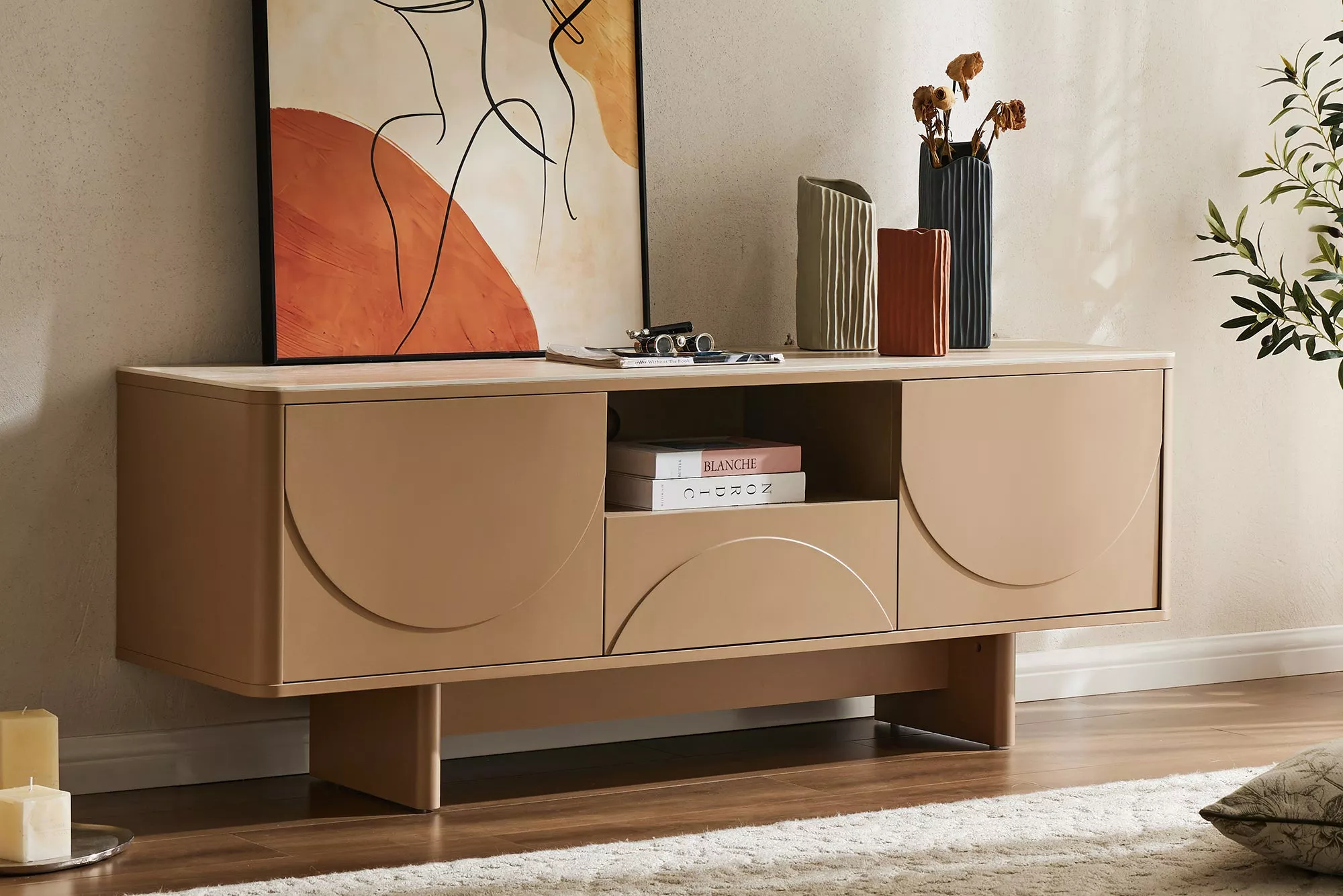 Designová televizní stolek SAVOY 150 cm v nadčasové kombinaci šedé‑béžové (greige) s keramickou deskou v travertinovém vzhledu zaujme moderním vzhledem a detailně zpracovanou 3D přední stranou, která dodává nábytku hloubku a sofistikovaný dojem. Komoda je vybavena prostorným šuplíkem, který poskytuje praktický úložný prostor pro dálkové ovladače, média a další nezbytnosti obývacího pokoje. Díky bezúchytovému systému otevírání je používání pohodlné a celkový design zůstává čistý a elegantní. Tato TV komoda je ideální volbou pro obývací pokoj, televizní zónu nebo relaxační kout, kde spojí funkčnost s moderním a stylovým řešením.