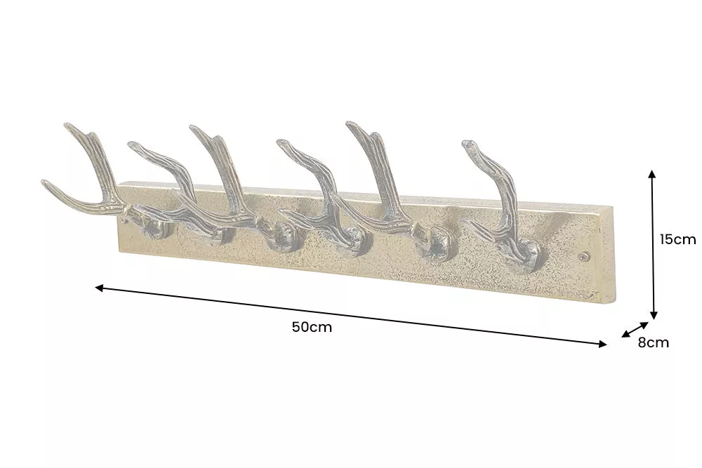 Tento nástěnný věšák je vyroben z kvalitní kovové slitiny s elegantní povrchovou úpravou v mosazné barvě, přičemž každý z šesti háků je stylizován jako malý jelení paroží. Díky šesti hákům nabízí dostatek prostoru pro kabáty, šály, tašky nebo doplňky — ideální do předsíně, chodby nebo šatny. Minimalistický, a přitom dekorativní design přinese do interiéru jemný přírodní prvek s luxusním nádechem.