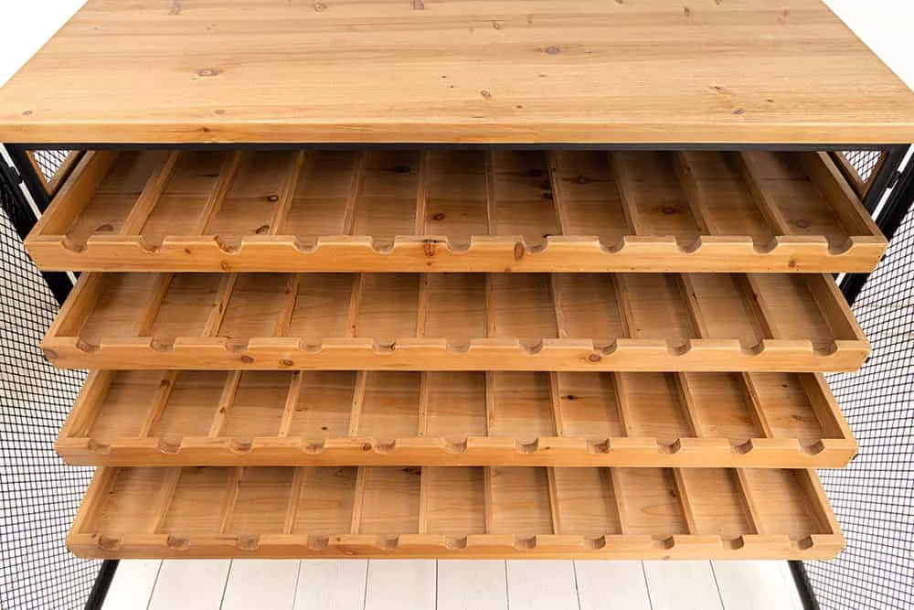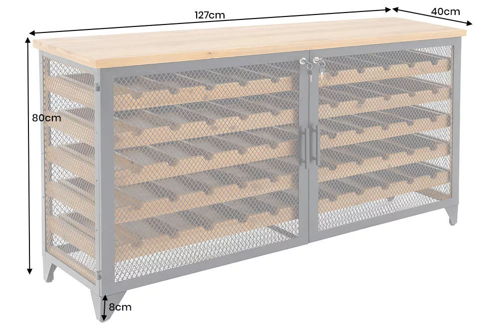 Rozměry vinotéky jsou 127 cm na výšku, 80 cm na šířku a 40 cm na hloubku, což umožňuje že se skvěle hodit i do menších prostor. Díky použití přírodních materiálů je každý kus unikátní a drobné odchylky v barevnosti nebo struktuře přidávají vinotéce na charakteru.