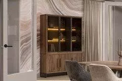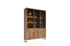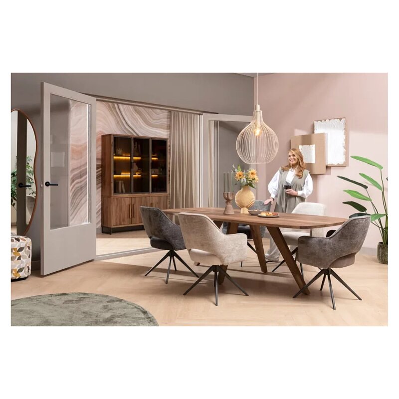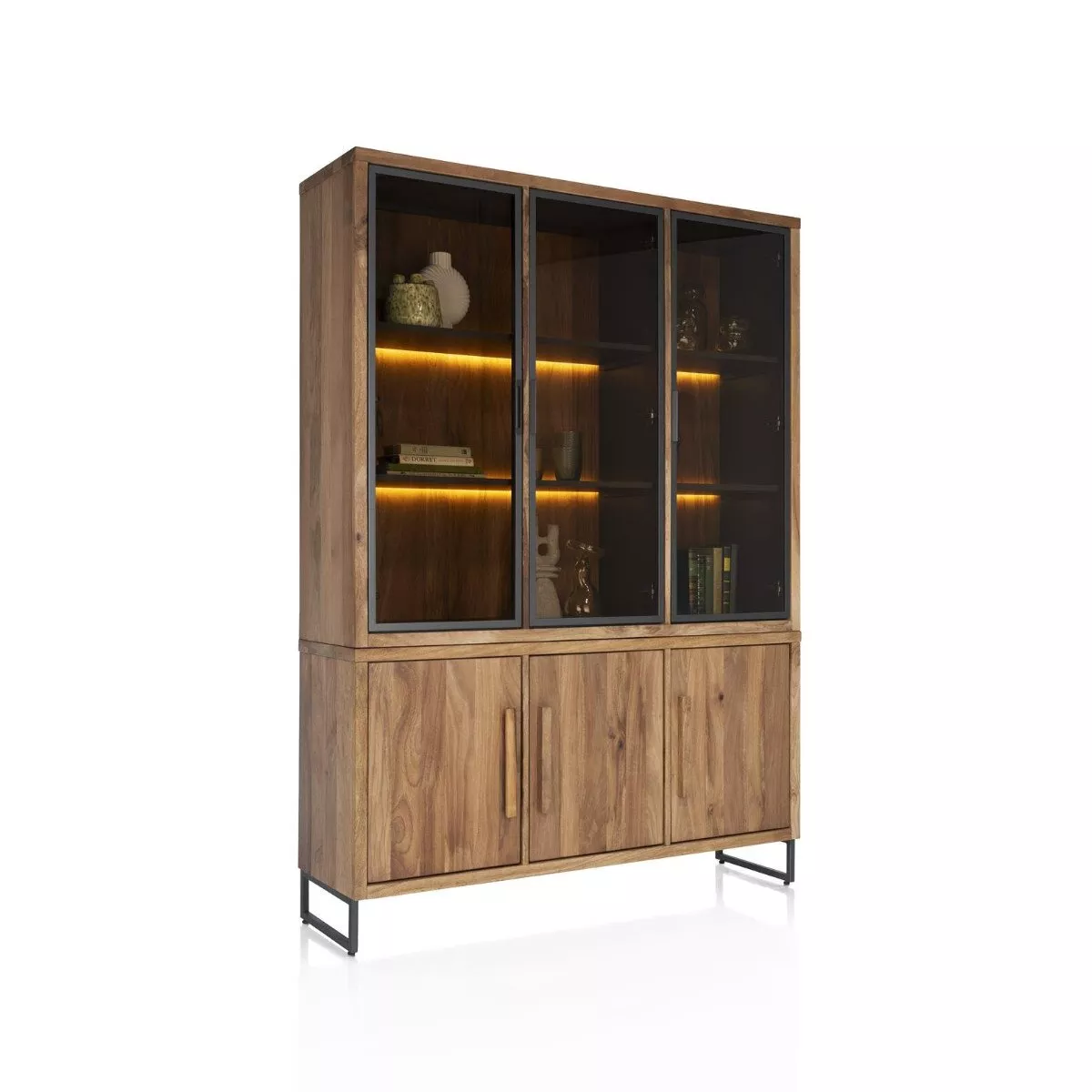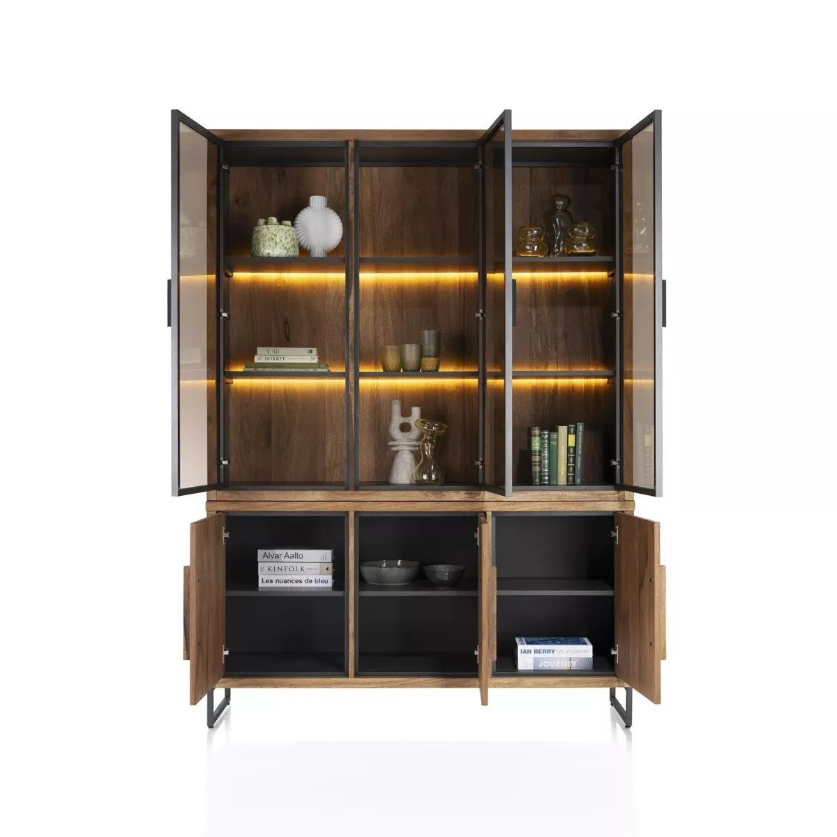 Vitrína EVEREST 210 CM kombinuje prostorné úložné řešení s přírodním, robustním a jemně industriálním designem. Disponuje šesti dvířky – třemi dřevěnými a třemi skleněnými – která umožňují přehledně uložit nádobí, knihy i designové dekorace. Dominantním prvkem je lakovaná mangová dýha s výraznou strukturou, která zvýrazňuje přírodní charakter nábytku a přináší interiéru útulnou atmosféru.