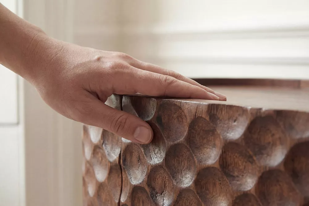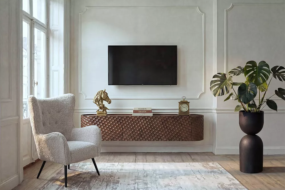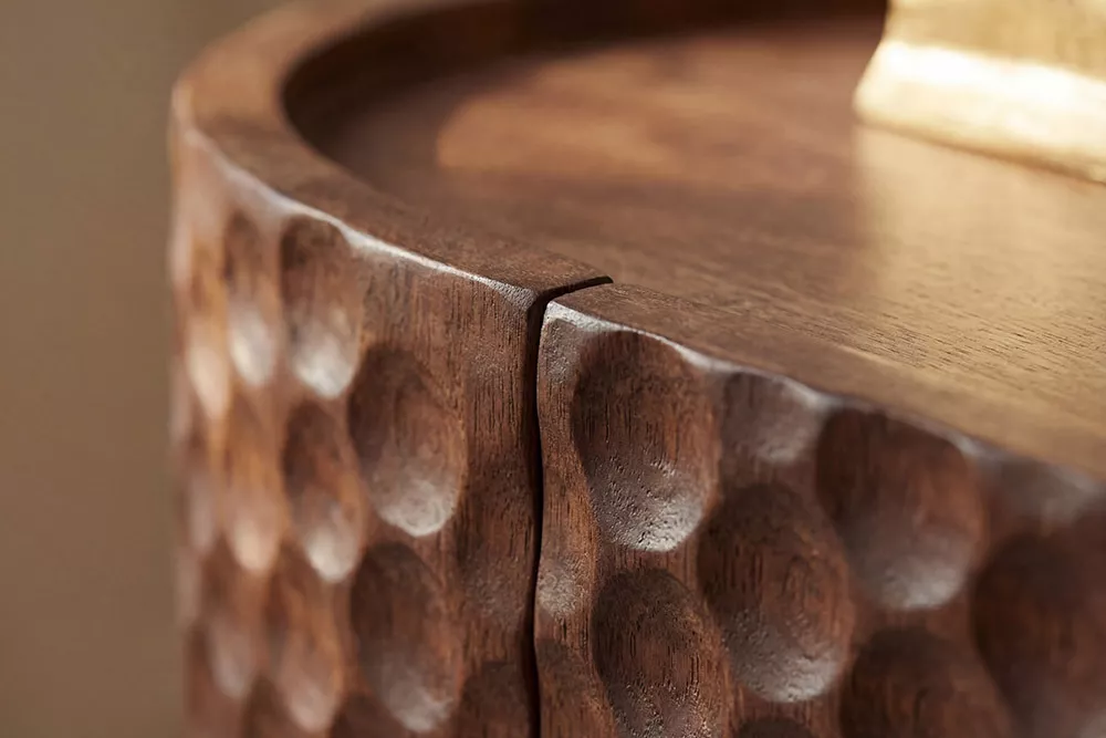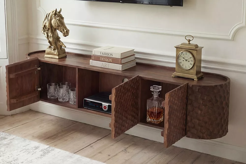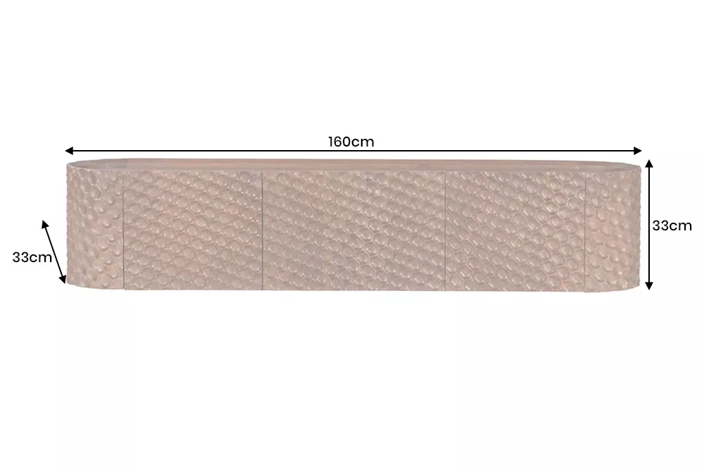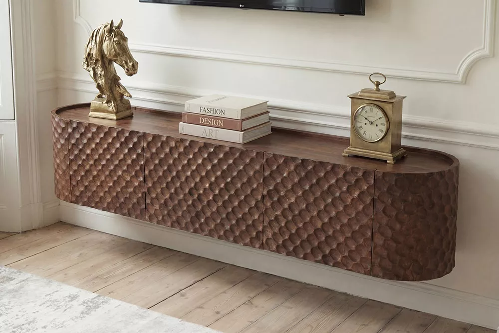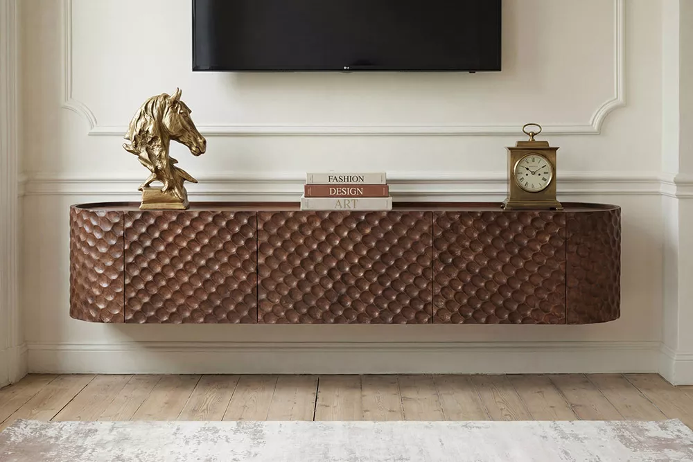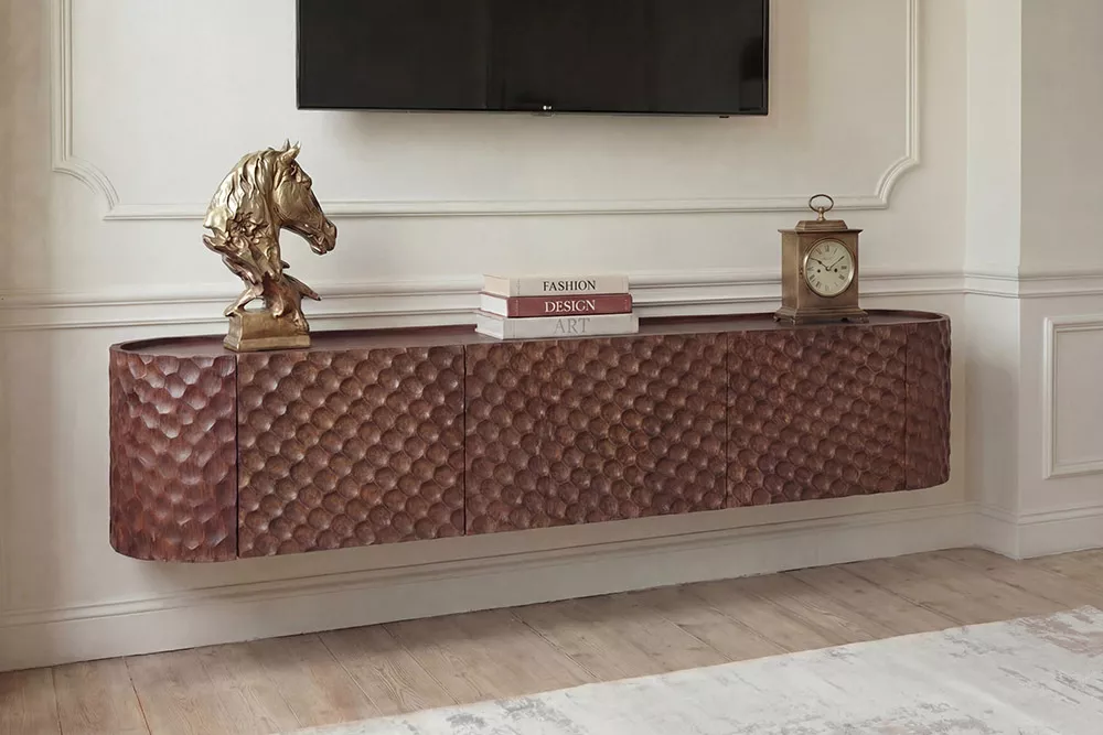 Závěsný televizní stolek ADLON z masivního mangového dřeva zaujme výraznou 3D čelní plochou ve struktuře včelí plástve, která dodává nábytku hloubku a jedinečný charakter. Hnědý odstín zvýrazňuje přirozenou kresbu dřeva, zatímco nástěnné provedení působí lehce a moderně a opticky zvětšuje prostor. Praktické členění se třemi uzavíratelnými částmi, kabelovým otvorem a soft-close mechanismem zajišťuje pohodlné, tiché a přehledné používání. Tento televizní stolek se stane výrazným a funkčním prvkem každého moderního obývacího pokoje.
