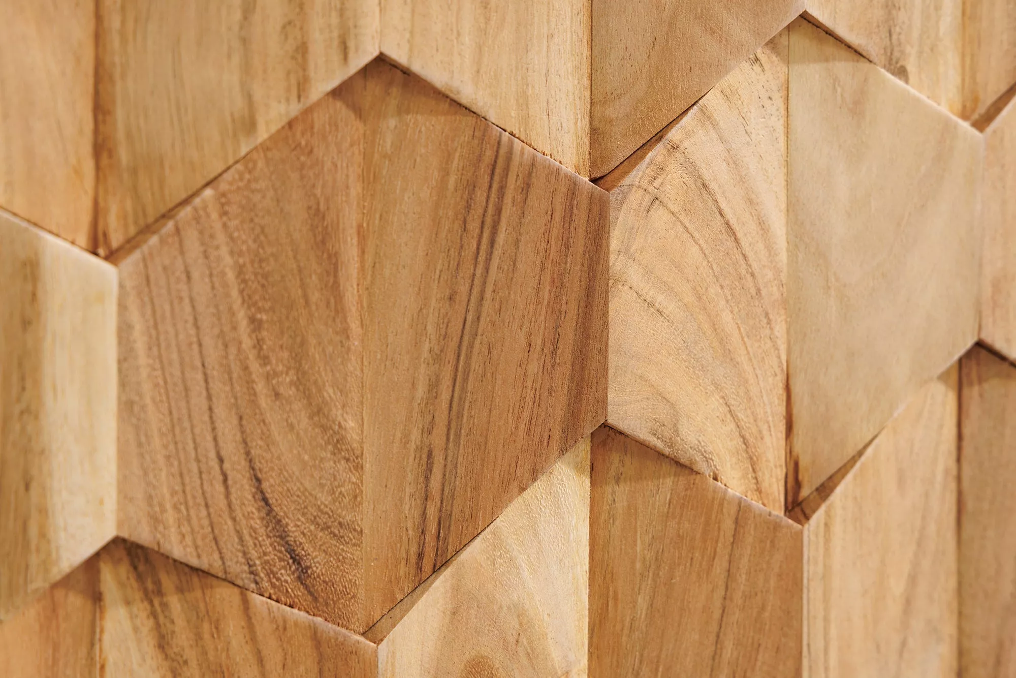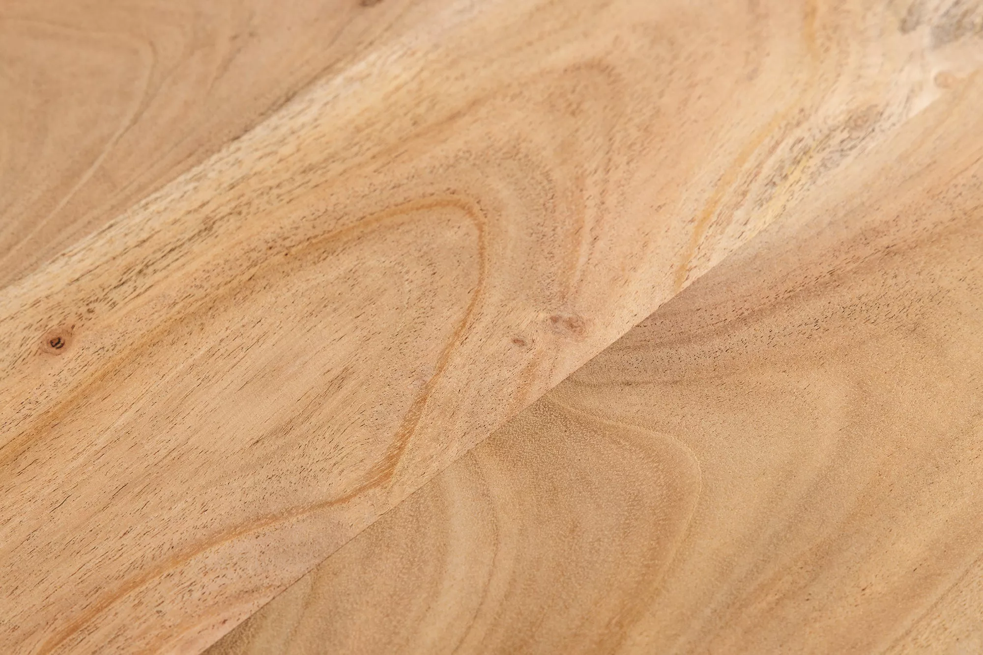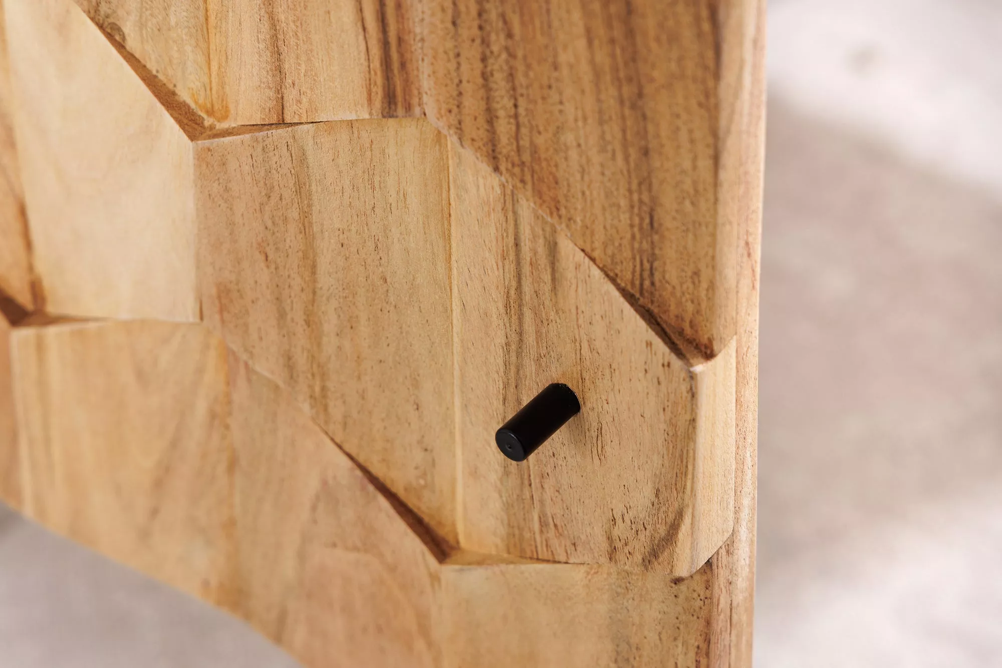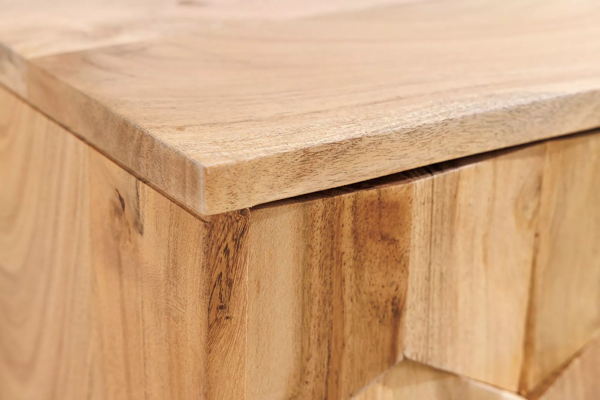 Závěsný televizní stolek z masivního akáciového dřeva vyniká výraznou 3D strukturou přední strany a přirozenou kresbou dřeva. Šířka 160 cm nabízí dostatek prostoru pro televizi i elektroniku, zatímco uzavřené úložné části pomáhají udržet čistý a uspořádaný vzhled obývacího pokoje. Díky nástěnnému provedení působí stolek lehce, moderně a opticky odlehčuje prostor. Každý kus je originál s jedinečným charakterem masivního dřeva, který dodá interiéru přírodní eleganci a nadčasový styl. Expresivní 3D povrch je vyroben s využitím propracované ruční práce.