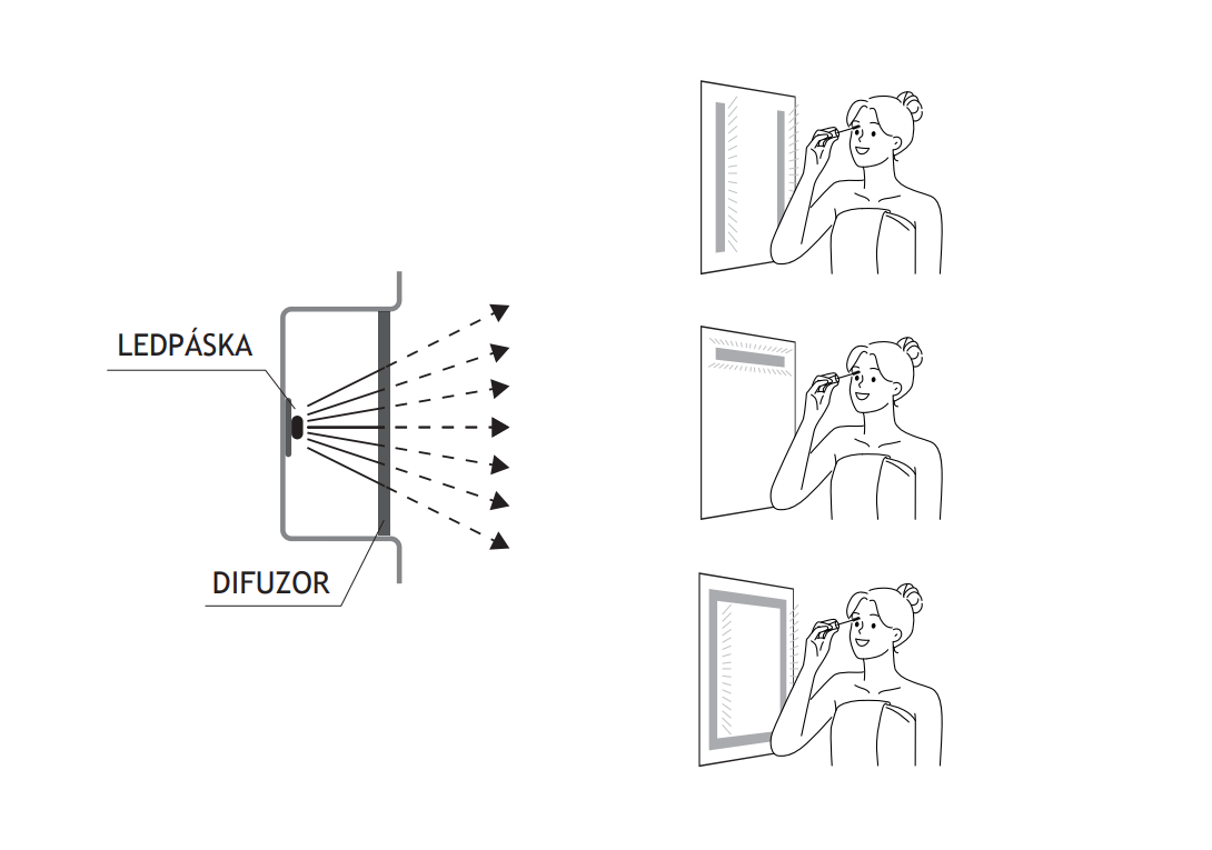 Rozměry: šířka 60 cm a výška 70 cm. Zrcadla Luna Rounded s trendy zaoblenými rohy rozzáří Váš interiér světlem, které svítí přímo do popředí. Podsvícený pruh má rozměry 49 x 4 cm a spotřeba el. energie integrovaného svítidla je 11 W. Svítidlo na tomto výrobku obsahuje světelný zdroj s třídou energetické účinnosti G. Splňuje stupeň krytí IP44. Další informace k použitému LED pásku: Barva světla: 4000 °K (neutrální). Zrcadlo je vybaveno 2 ks úchyty pro svislé zavěšení a je v provedení se stiskacím vypínačem. Celková tloušťka zrcadla včetně podsvícení je cca 3,5 cm. U zrcadel s osvětlením doporučujeme vývod elektřiny umístit „na střed zrcadla“.